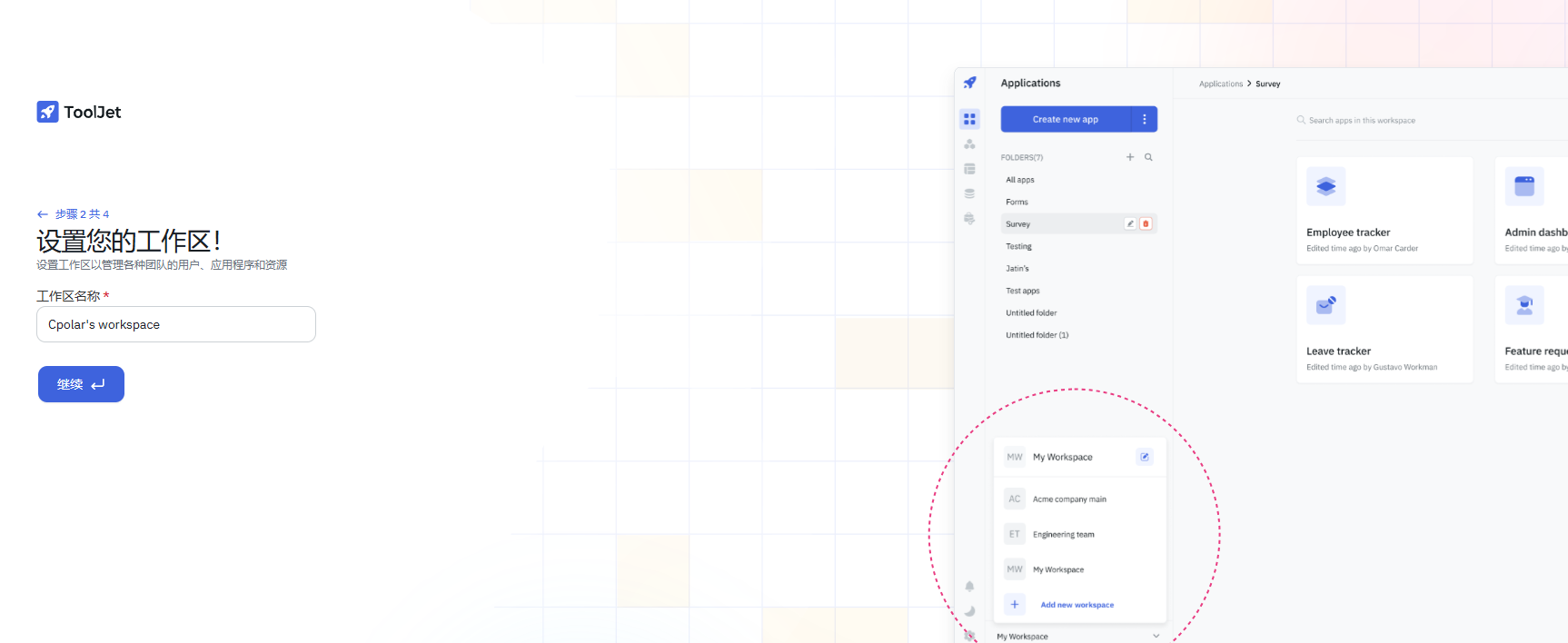 本实践教程为您展示了在Ubuntu系统中通过容器化技术快速部署ToolJet的标准化流程,并系统解析了如何结合cpolar服务实现内网穿透功能。这种技术组合创新性地将动态IP地址转化为可访问的固定域名,为远程开发场景提供了突破性的解决方案。通过Docker的镜像管理机制与cpolar的智能隧道技术,开发者无需复杂配置即可构建跨地域的协作环境。无论是快速验证产品原型,还是组建分布式开发团队,这种技术架构都能显著提升项目交付效率。如果您在实践过程中遇到技术瓶颈,或对低代码开发有创新应用设想,欢迎在讨论区交流您的技术洞察,让我们共同拓展数字建造的边界!