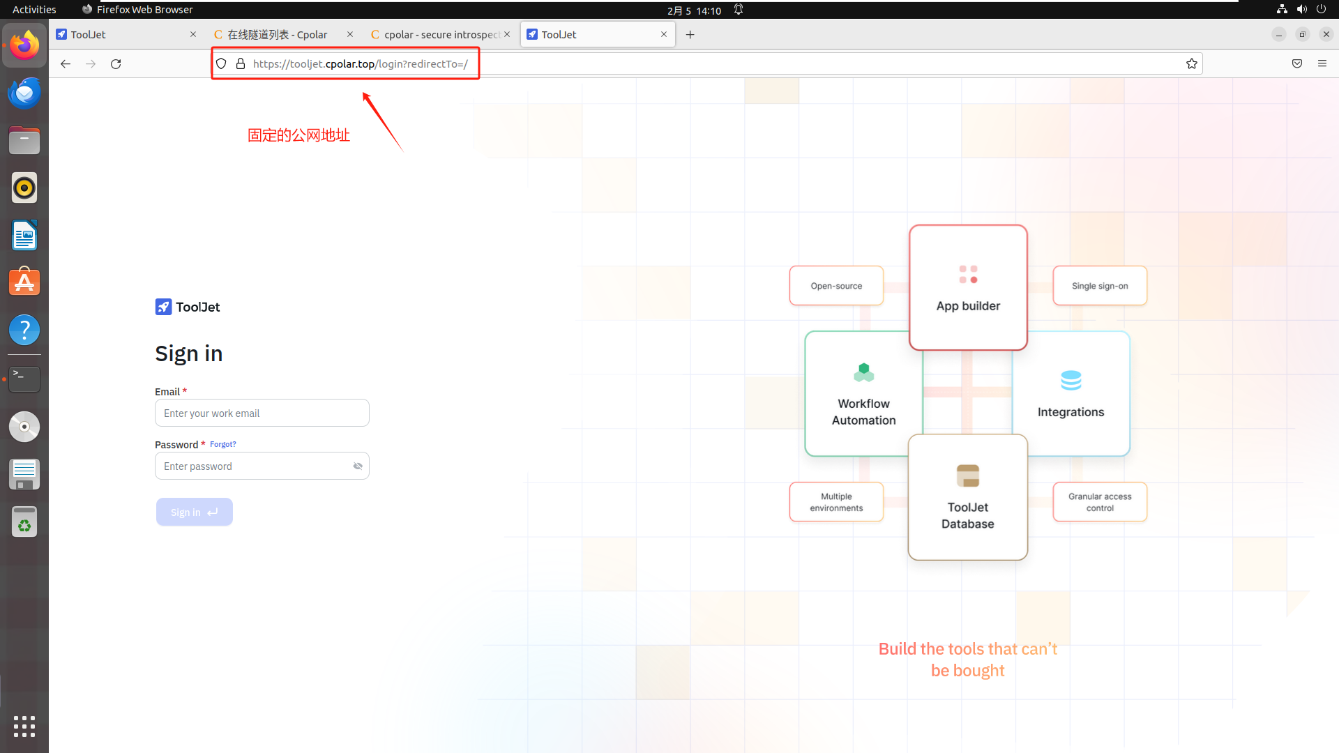最后,我们使用固定的公网地址在任意设备的浏览器中访问,可以看到成功访问本地部署的ToolJet页面,这样一个永久不会变化的二级子域名公网网址即设置好了。
