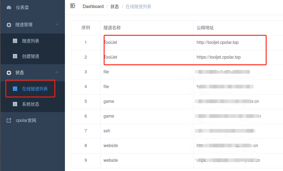 更新完成后,打开在线隧道列表,此时可以看到随机的公网地址已经发生变化,地址名称也变成了保留和固定的二级子域名名称。