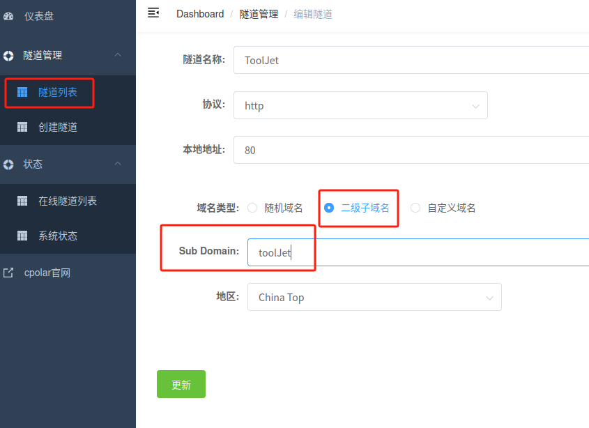 修改隧道信息,将保留成功的二级子域名配置到隧道中