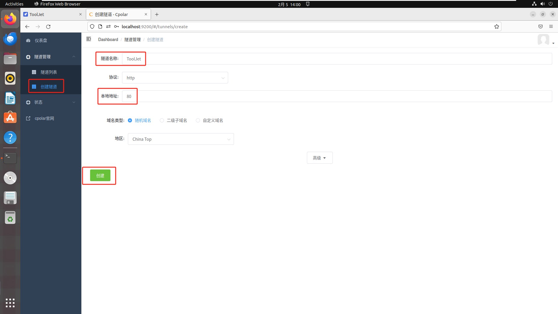 - 隧道名称:可自定义,本例使用了:ToolJet,注意不要与已有的隧道名称重复