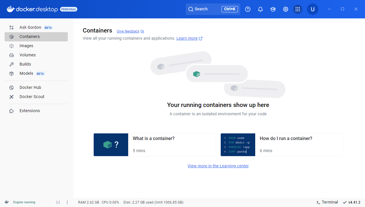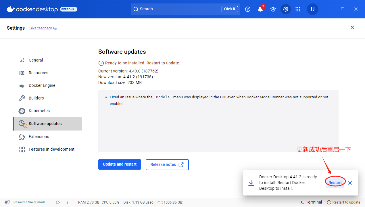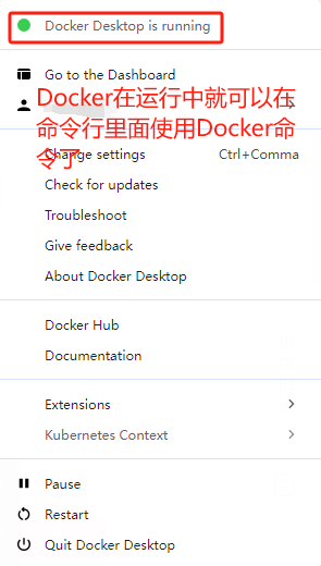 安装成功!然后桌面右下角也有一个Docker鲸鱼小图标,右键图标就可以看到Docker状态。