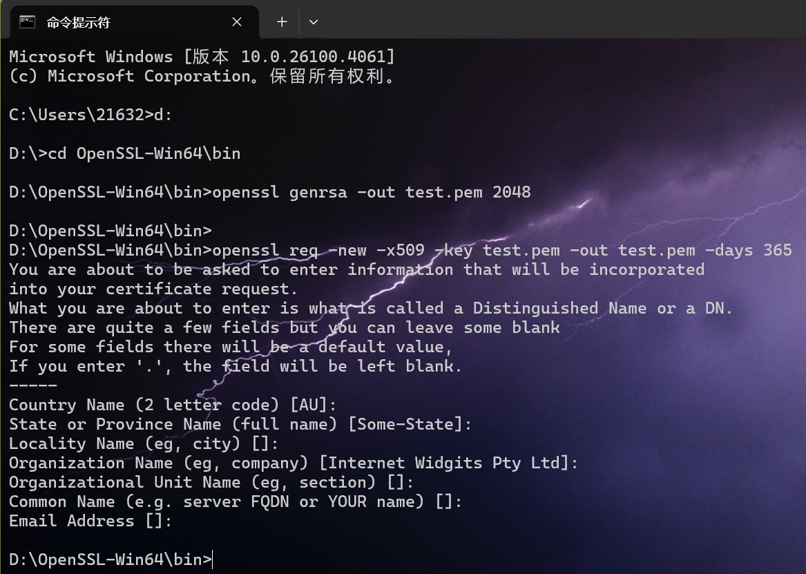 执行后会提示你填写一些信息,除了**Common Name全部回车即可,例如: