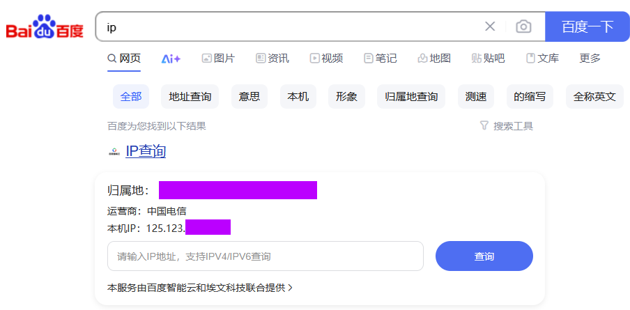 等待大约10min,待光猫重启完后。我们百度搜索 “ip”