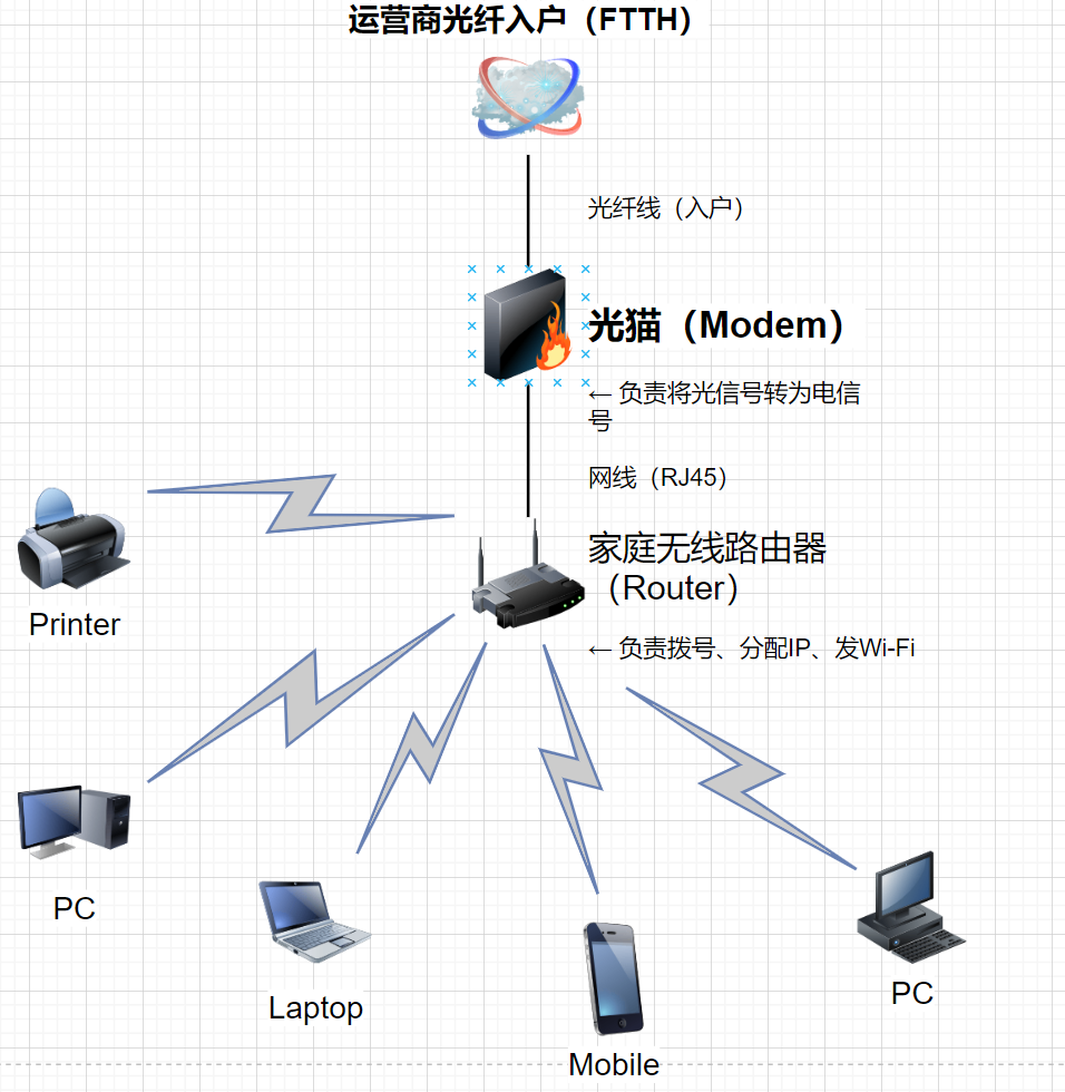 为了更好理解我给出我家中的宽带网络拓扑图以及介绍家庭路由器、光猫、PPPOE拨号、桥接模式的概念: