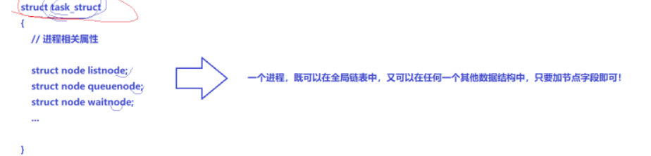 顺便提到一点Linux中的task_struct中的链式结构并不是和普通双链表那样将节点和属性放在一起,它的链表节点中只有next节点和prev节点,然后在task_struct中和其他属性一起储存。这样做的好处是能够让一个task_struct在多个队列(调度和阻塞)中存在,而不需要将相同的进程属性放在不同的链表之中再链接。如图所示
