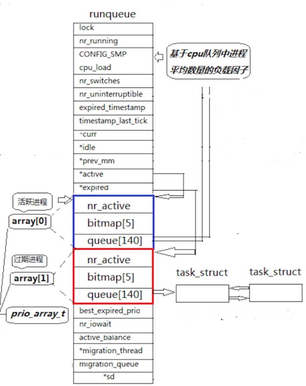 说了这么多优先级的本质还是为了更好的了解Lniux调度算法。这个算法并不是简单的FIFO调度,cpu在调度进程时会在一个runqueue结构体中选择需要调度的进程,这个runqueue主要由一个有两个元素queue结构体数组,两个指向queue结构体数组的指针,*active和*expored即活跃的和过期的,以下用示意图说明。