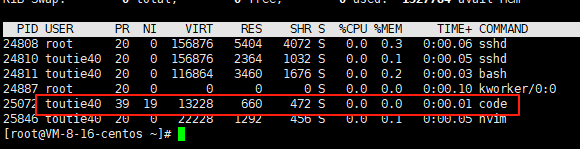 这里可以看到,PRI为39 NI值为19,这是我修改以后的数值,原本是PRI 20 NI 0,即使我输入修改100但是最后值修改了19,说明修改NI值是有范围的 ,这是为了进程调度尽量公平,不会出现个别极端进程,为什么是在这40的范围内后续我们会讲到。