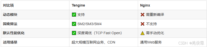 Tengine 是一个由淘宝网发起的 Web 服务器项目。它基于 Nginx 然后针对大访问量网站的需求,添加了很多高级功能和特性,从 2011 年 12 月开始,Tengine 正式开源。Tengine 的性能和稳定性已经100多家大型网站如淘宝网,天猫商城、Youku、AliExpress、 Lazada 、Alibaba Cloud等得到了生产型检验。Tengine定位于打造一个高效、稳定、安全、易用的 Web 平台 目前已100% 兼容 Nginx的配置语法和模块,用户还可无缝迁移现有Nginx服务,同时享受增强功能,但需要注意安全漏洞,近期安全通报显示部分版本存在漏洞,请及时加固更新。另外,Tengine 没有像 Spring Cloud Gateway 那样为微服务架构提供原生支持(比如直接与 Eureka、Consul 等服务发现组件集成),但 Tengine 仍然可以通过 反向代理的方式 与微服务架构组合使用,尤其是在 Kubernetes 环境中,通过 Ingress 的方式实现负载均衡和路由功能。