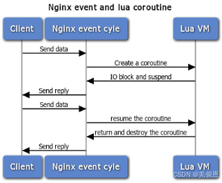 Lua模块在初始化时为每个Nginx工作进程创建一个Lua/LuaJIT实例(LuaVM),同一进程处理的所有请求将共享该实例,并且Lua模块将用户Lua代码包装为协程工厂缓存在Nginx内,一个请求到来时协程工厂为它分配一个独立协程来运行业务逻辑。在需要进行阻塞的I/O操作时,Lua模块自动将I/O操作委托给Nginx的事件处理模型,并保存正在运行的协程上下文,返回到Nginx工作进程中处理其他请求,等到I/O操作完成时,又会恢复该协程继续运行。