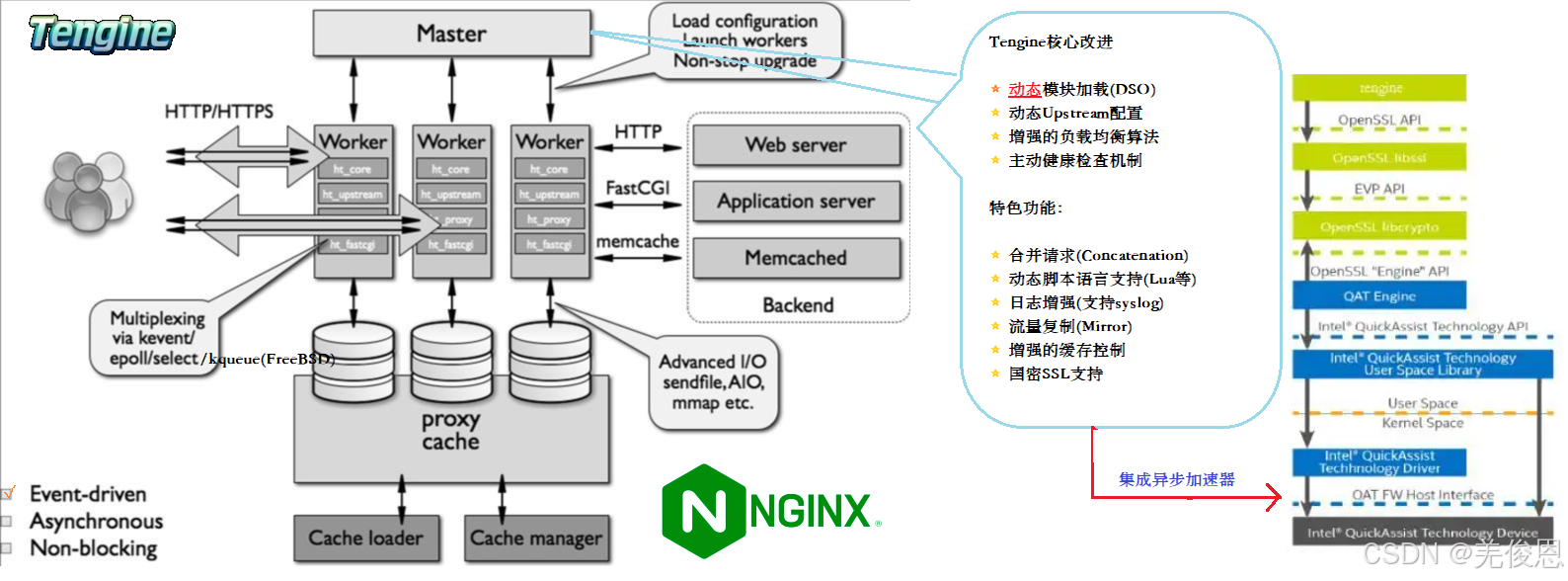 - 支持HTTP/3 (QUIC v1 和draft-29方式);支持异步SSL/TLS模式,可以使用QAT(intel QuickAssist Technology)来卸载和加速SSL,显著提升性能。