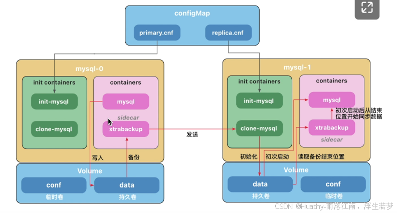 pod中运行了俩个容器,MySQL容器和一个充当辅助工具的xtrabackup容器,我们称为边车sidecar。