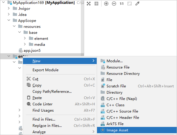 1、在工程中选中模块或文件,右键单击New > Image Asset,进入图标配置页面,然后把图片都加到对应的文件夹,
