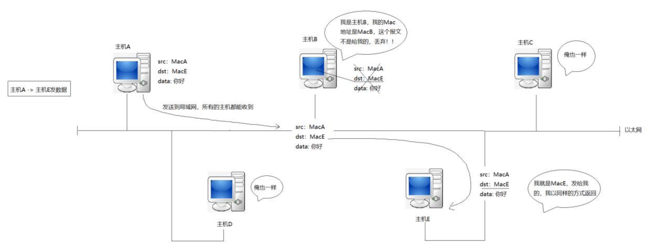 - 当消息传到主机E的时候,对比发现,目标Mac地址就是自己的Mac地址,于是处理信息,并发一条信息通知主机A,我已经收到你的消息了。