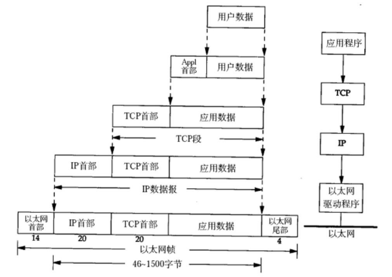 当应用程序的数据需要通过网络发送时,它会自顶向下穿过协议栈的每一层,每一层都会执行封装操作: