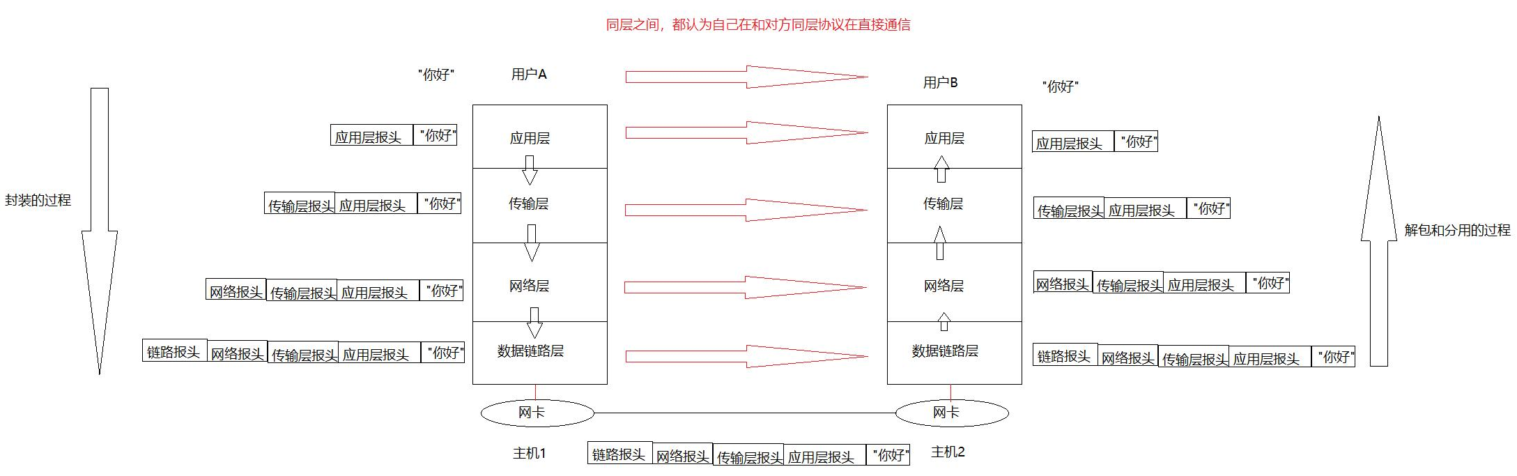 站在每一层的视角来看,他们是直接和接收主机的每一层通信的,因为封装的报头只有同层可以解包。