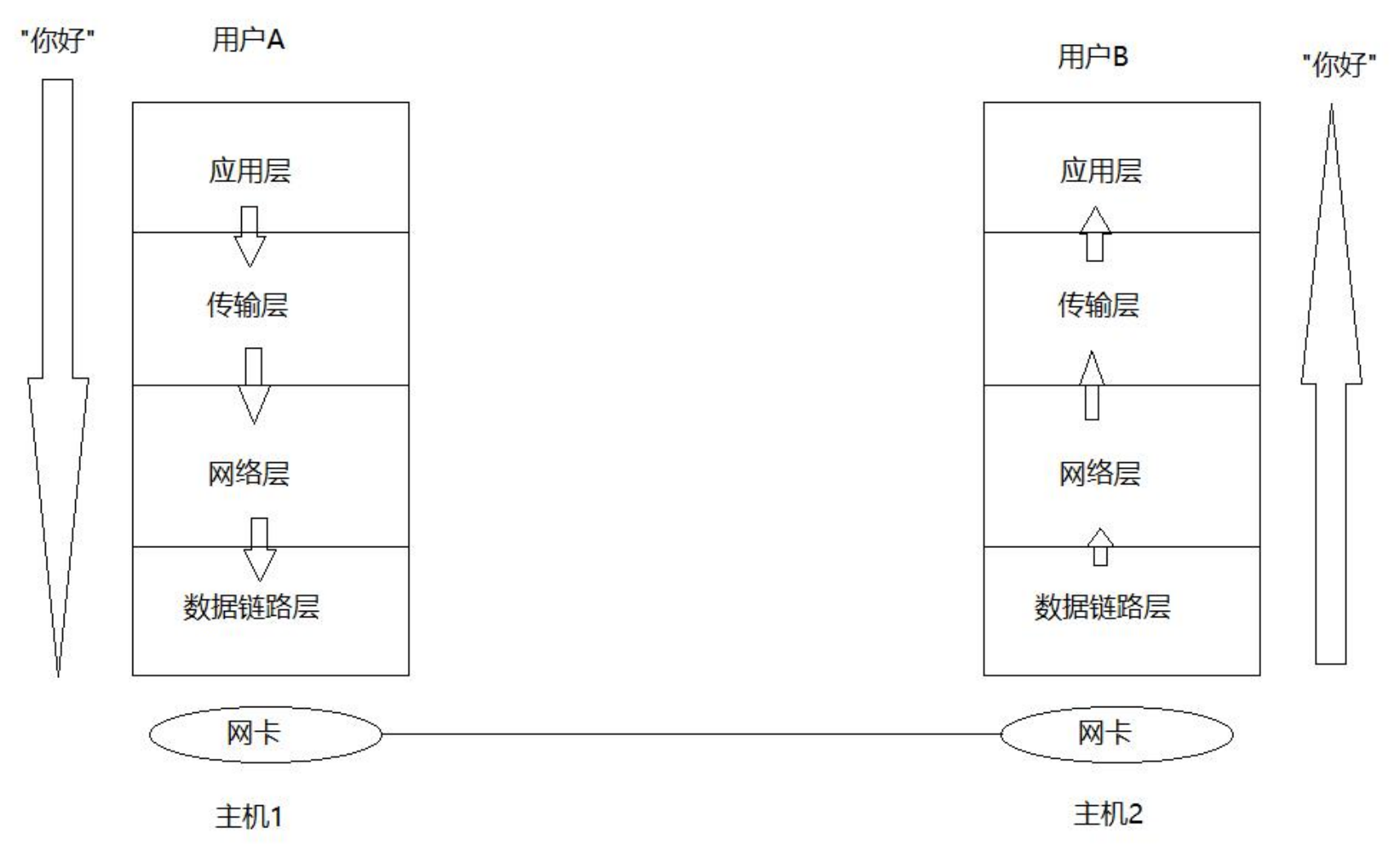 用户A(人)向用户B发送数据,内容为“你好”。