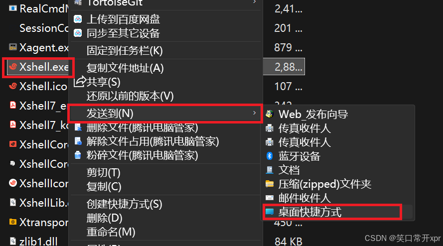 如 果 桌 面 没 有 快 捷 方 式,可 以 进 入 文 件 管 理,找 到 第 6 步 文 件 夹 的 位 置,找 到 Xshell 软 件 的 图 标,右 键 选 择 发 送 到 点 击 桌 面 快 捷 方 式。