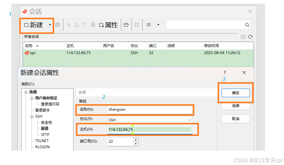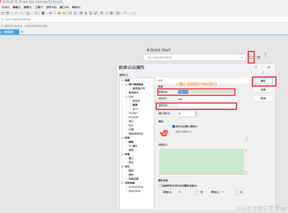 重 启 Xshell,如 图,选 择 新 建,然 后 输 入 名 称 和 云 服 务 器 的 地 址,点 击 确 定。