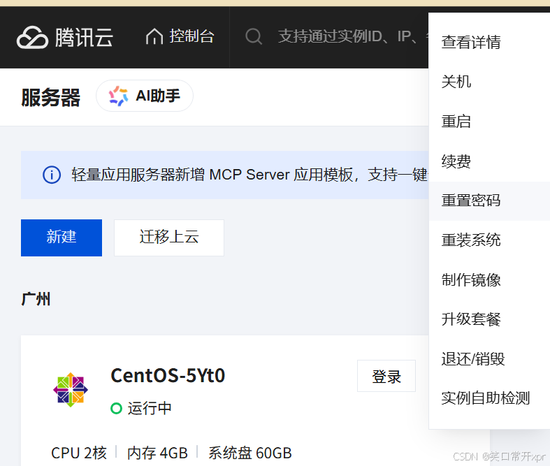 - 设 置 root 密 码:勾 选 服 务 器,点 击 重 置 密 码(这 个 环 节 可 能 需 要 手 机 短 信 验 证)。root 密 码 建 议 设 置 的 稍 微 复 杂 一 些,否 则 容 易 被 黑 客 入 侵。
