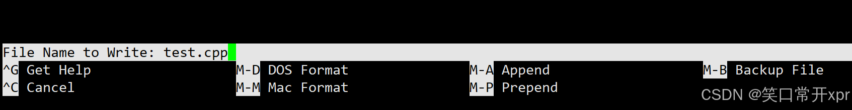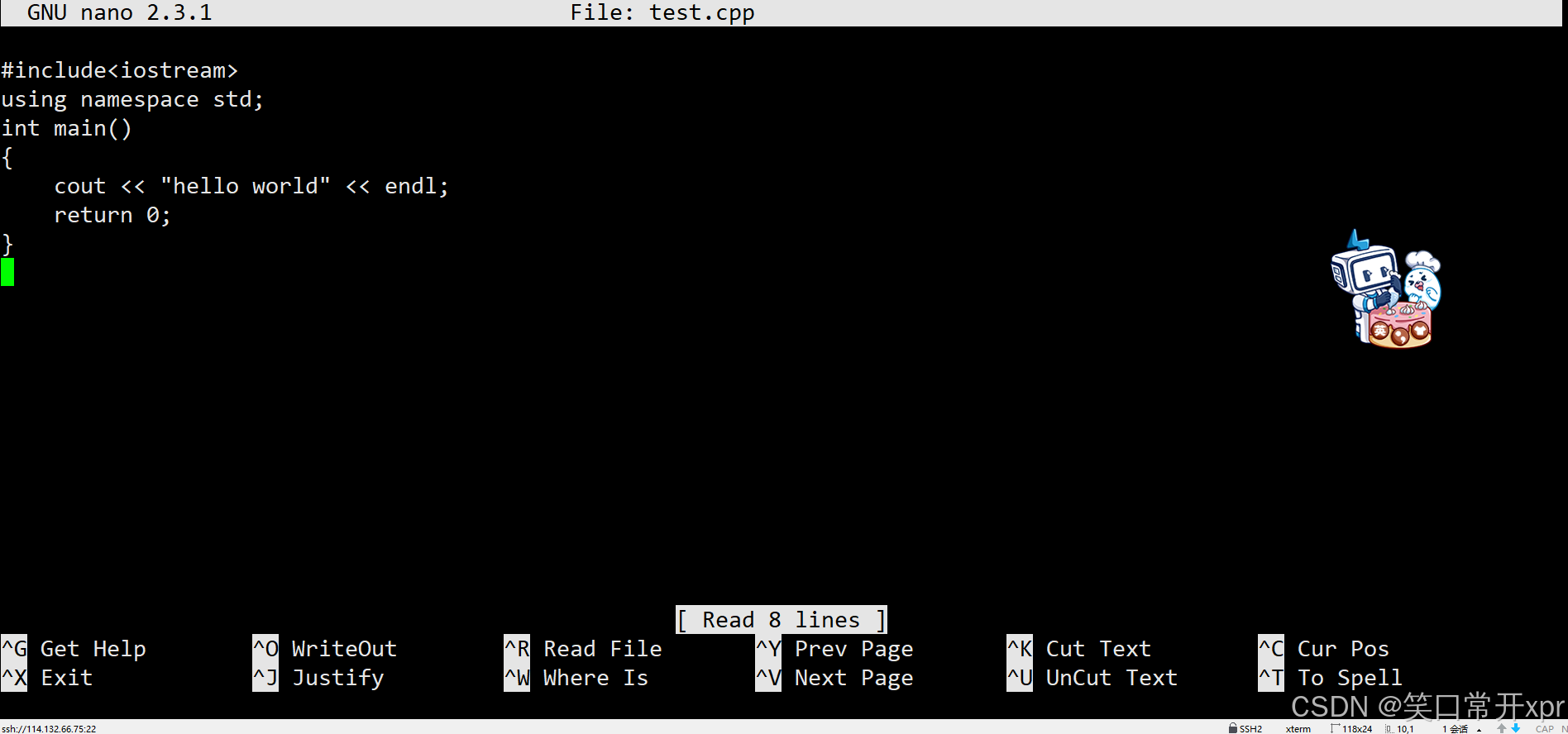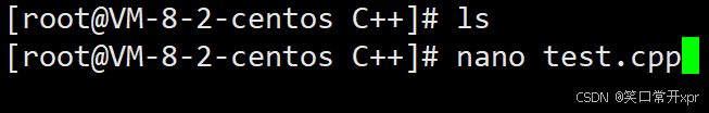 - 输 入 nano test.cpp 打 开 并 新 建 文 件。