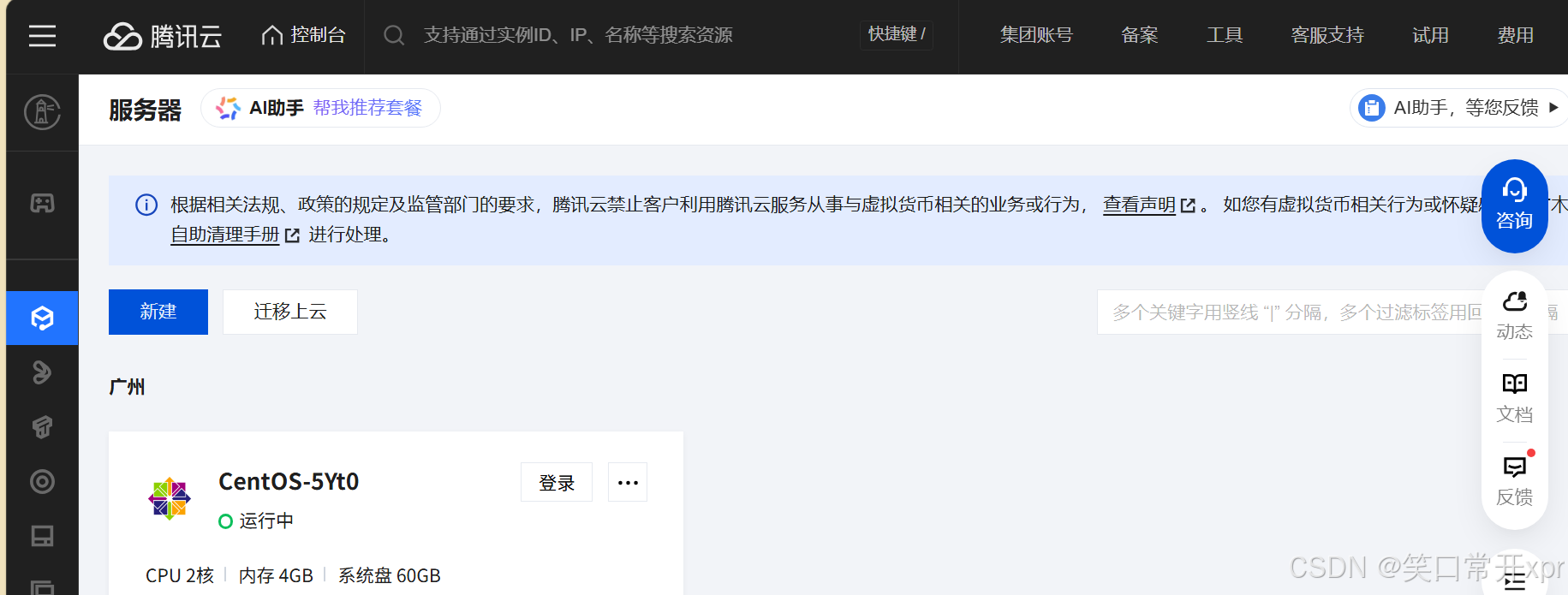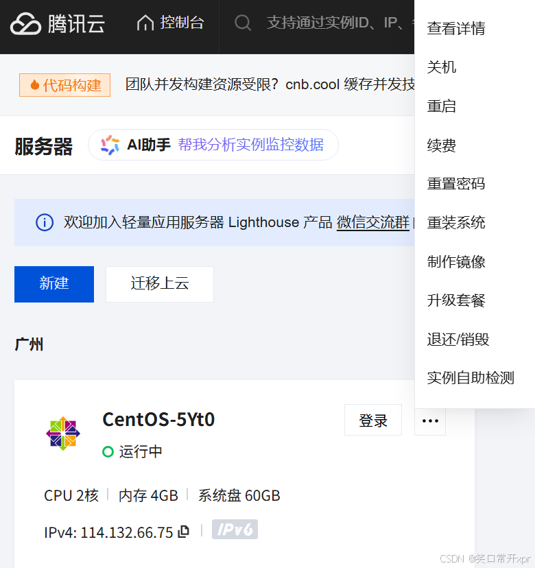 这 里 以 腾 讯 云 为 例 进 行 介 绍,注 意 需 要 选 择 CentOS。