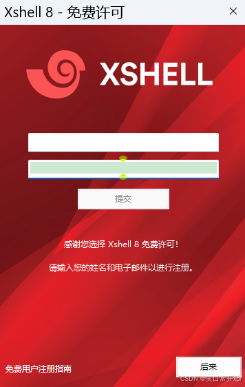 双 击 打 开 xshell 软 件,输 入 用 户 名 和 邮 箱 进 行 注 册,点 击 提 交 即 可。