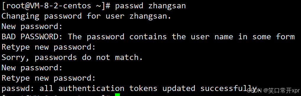 - 输 入 passwd + 用 户 名,可 以 给 新 用 户 设 置 密 码。需 要 输 入 两 次 密 码,这 里 注 意 输 入 的 密 码 是 不 显 示 的。这 里 如 果 用 户 忘 记 密 码,也 可 以 通 过 这 种 方 式 重 新 设 置 密 码。