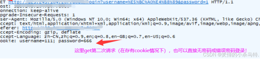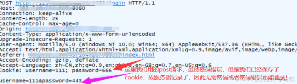 登录为例子,此时我们不能一个Set-Cookie后面跟账号密码就完了,因为浏览器会拿Cookie的第一个名称作为自己本地保存的名称,因此我们需要给它发两个Cookie:一个username,一个password,这样它就会呈现两个Cookie保存,发过来的时候合并成一个Cookie(如下图所示)就是上面我们看到的那样(就把它当做规则记住)!