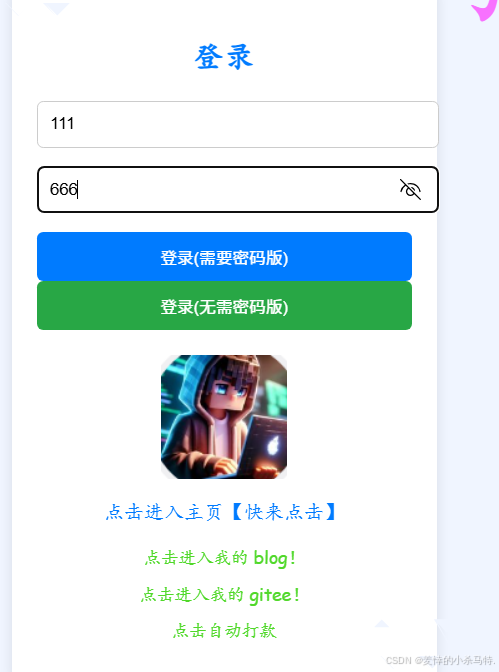 666,也就是只要用户输入的密码是666,无论用户名是什么,此时第一次输入正确密码,就建立Cookie然后给客户端发送作为Cookie保存,当后面无论输入什么或者不输入都能登录进来,然后我们给它加了个截止日期,也就是到时间Cookie自动清除,还有指定路径等!