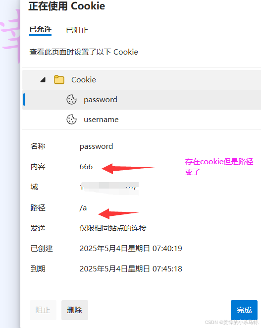 | path | / | 定义 Cookie 的作用范围。这里设置为根路径 /,意味着 Cookie 对.example.com 域名下的所有路径都可用。 |