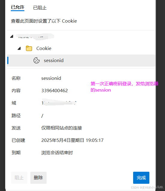 666.然后被服务端识别到是第一次,然后构建对应的唯一的session并且和资源绑定,然后作为Cookie发给浏览器,浏览器拿到后进行保存,当第二次,只要访问同一个服务端就会发送这个session,此时就随意登录了。