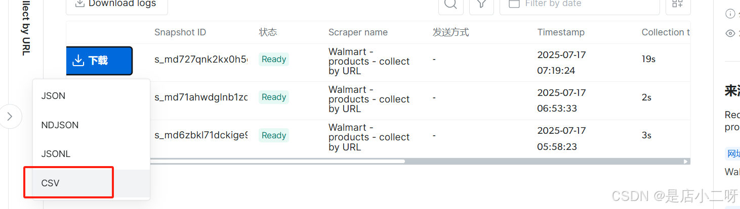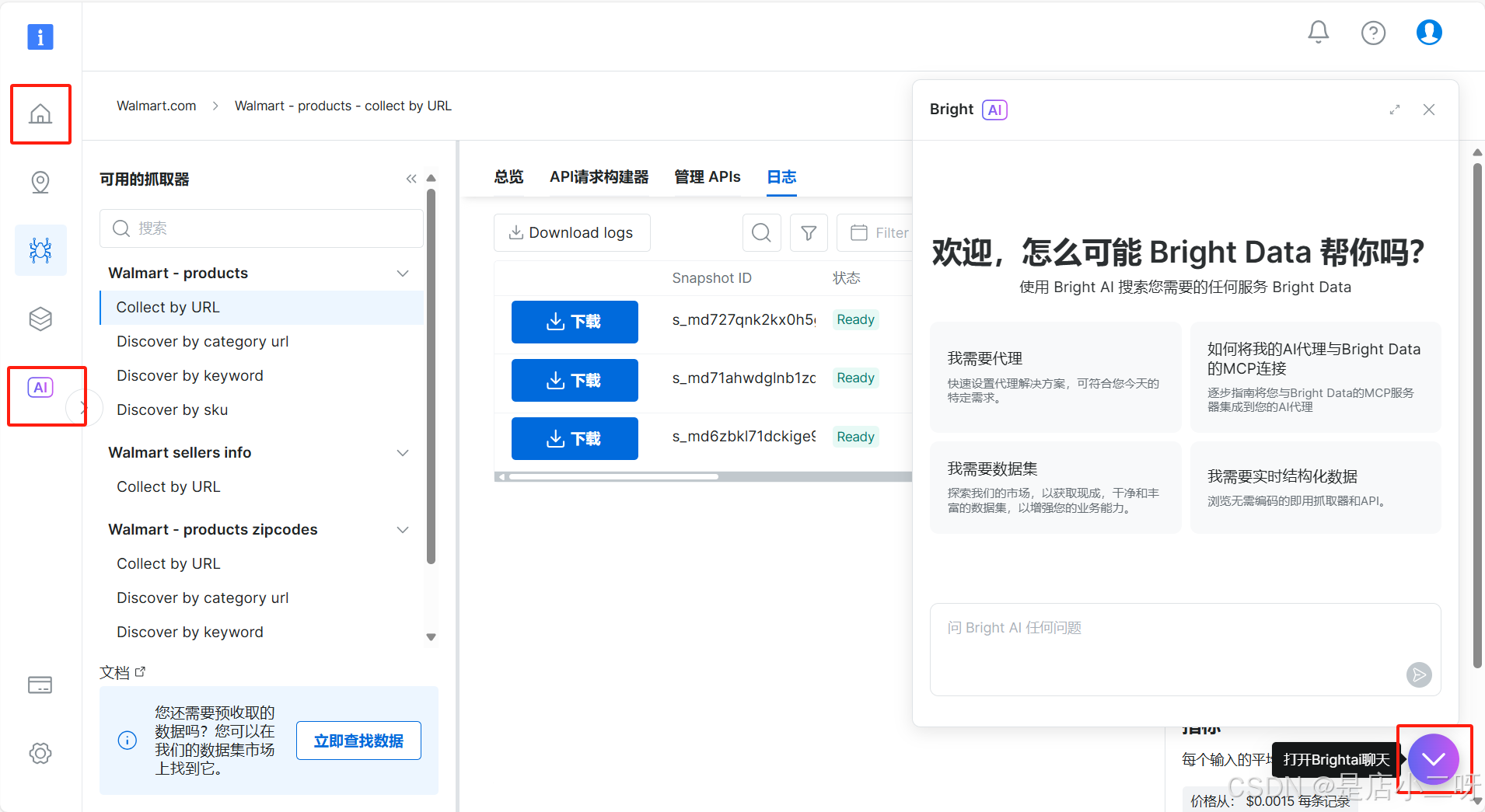 在[Web Srapers -> Walmart-products -> Collect by URL -> API请求构建器 ->管理APIs ->日志下载数据]