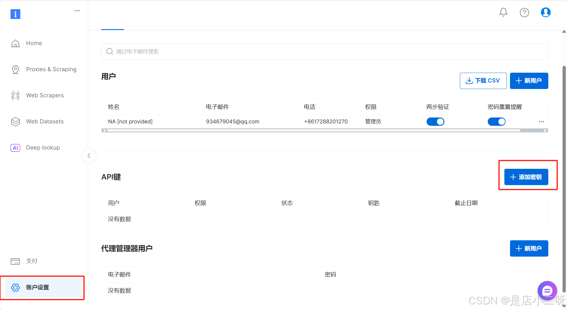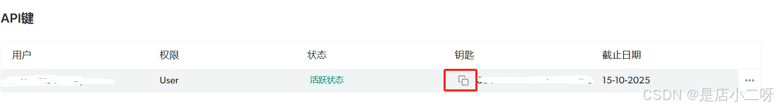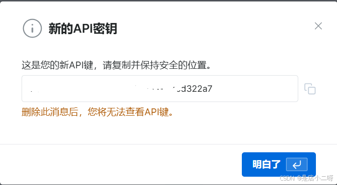 保存好你的API密钥,这里只会显示一次。如果忘记或者遗失API密钥,可以采用下面步骤获取。