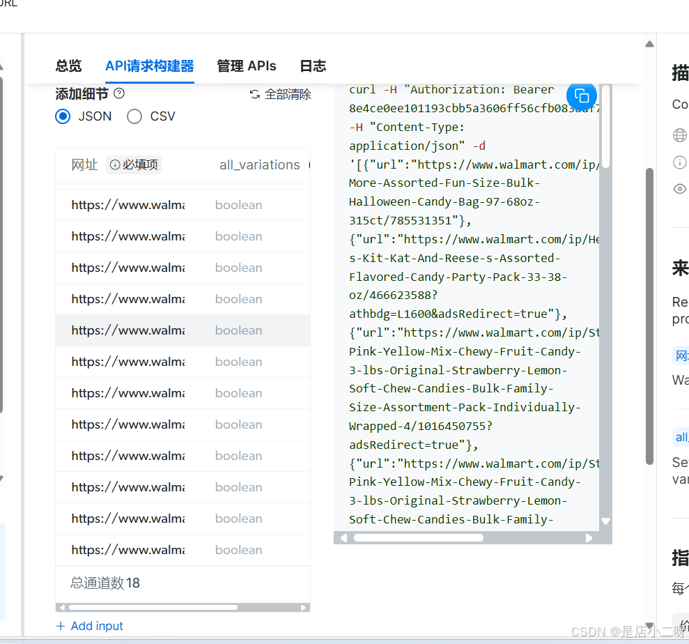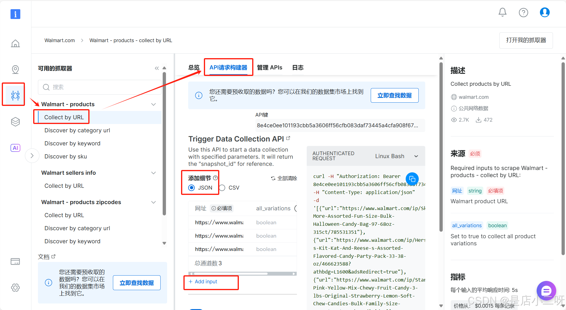 如果想要扩大抓取数据范围,可以在"API请求构建器"点击Add input进行添加相关"商品数据网页",但是不要一股脑添加,数据有所限制。