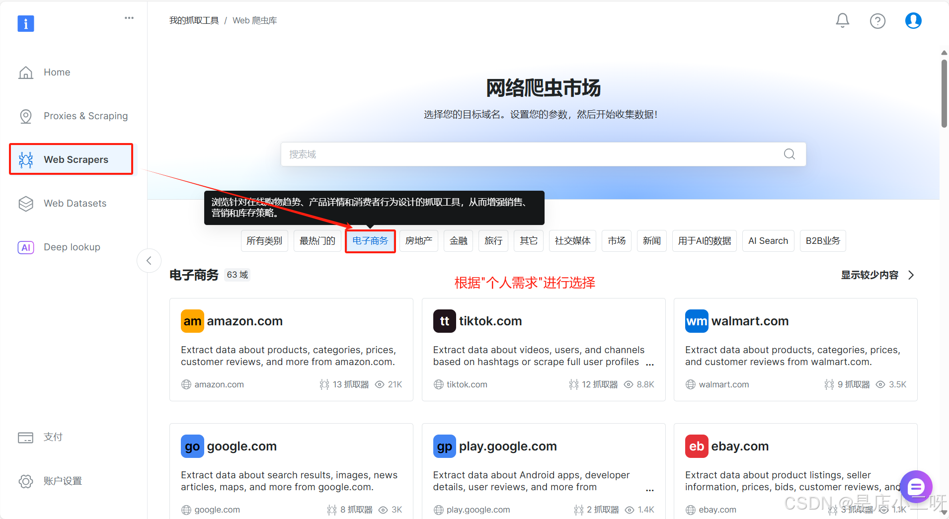 点击"Web Srapers",进入网络爬虫市场。根据具体需求进行类别选择,我需要"监控竞争对手电商价格"就需要选择"选择电子商务"。针对Amazon 、 Walmart 等平台的价格与库存数据,进行智能定价与库存优化,这里我选择了Walmart平台作为目标进行爬取。