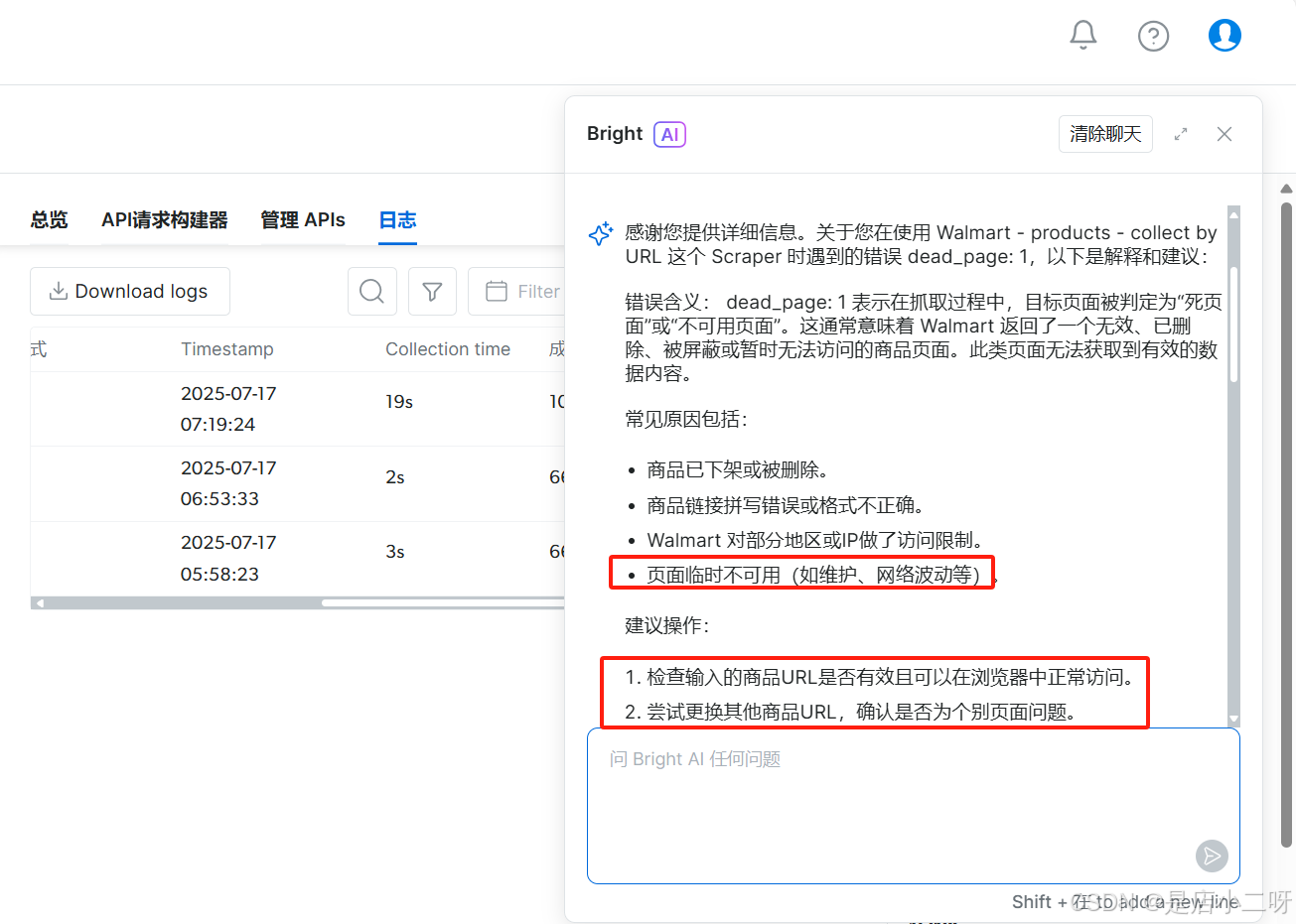 感谢您提供详细信息。关于您在使用 Walmart - products - collect by URL 这个 Scraper 时遇到的错误 dead_page: 1,以下是解释和建议: