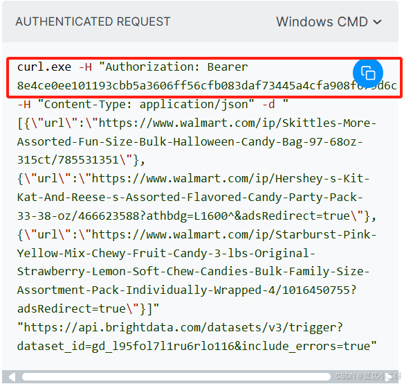 在AUTHENTICATED REQUEST进行选择,这里考虑到"零基础编程小白",直接选择Windows CMD本地运行处理,复制右边的命令函代码。