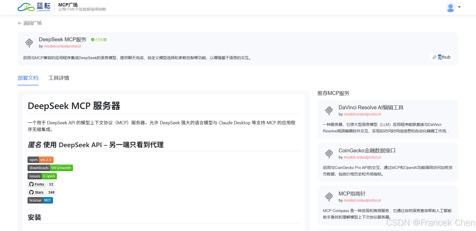 这里我们选择 DeepSeek MCP 服务器介绍相关的部署操作过程。(DeepSeek MCP 服务器 - GitHub)