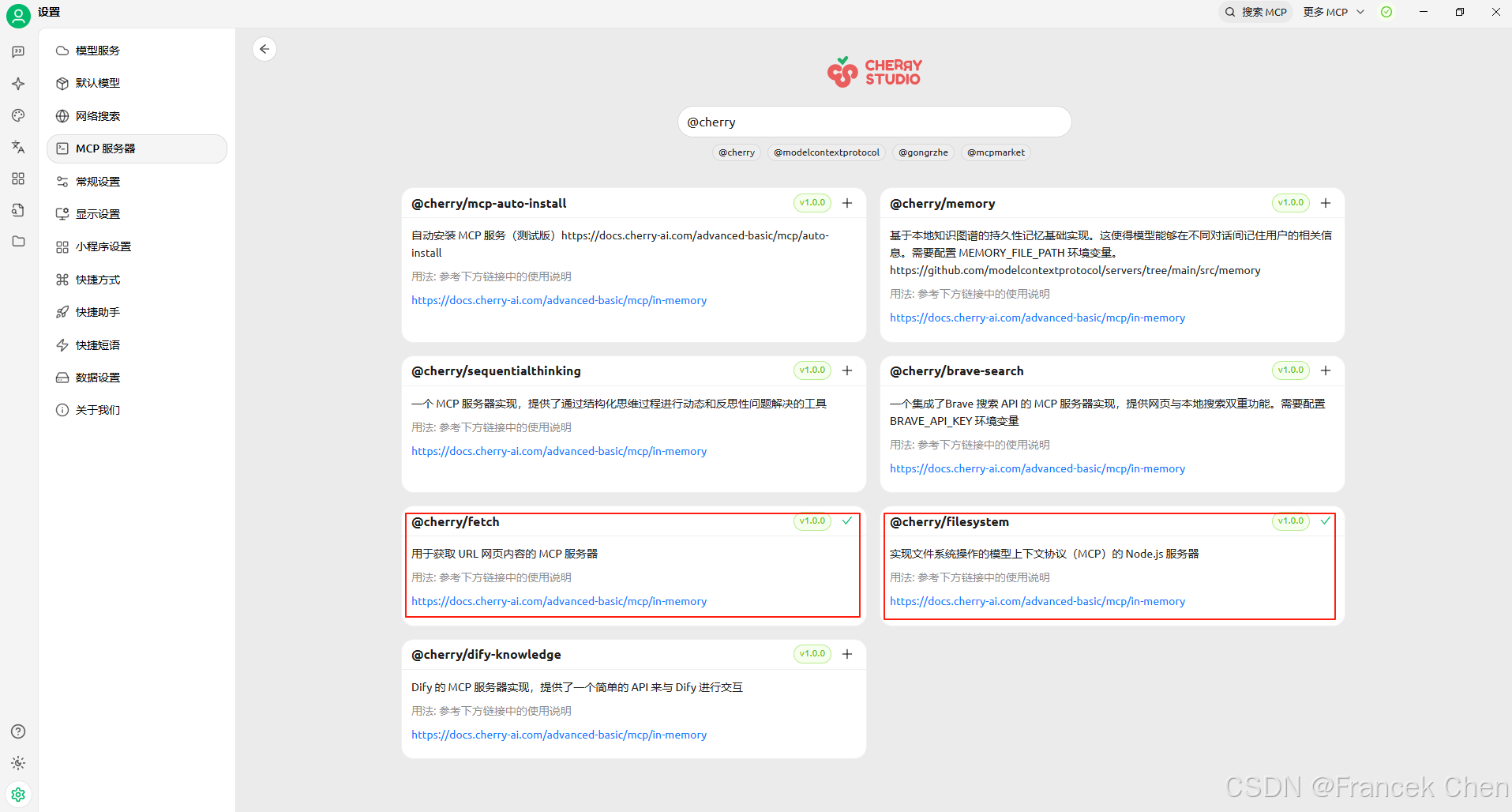 显示出来当前 Cherry Studio 已经集成的 MCP 服务,选择“fetch”和“filesystem”这两个服务,然后返回到对话界面。
