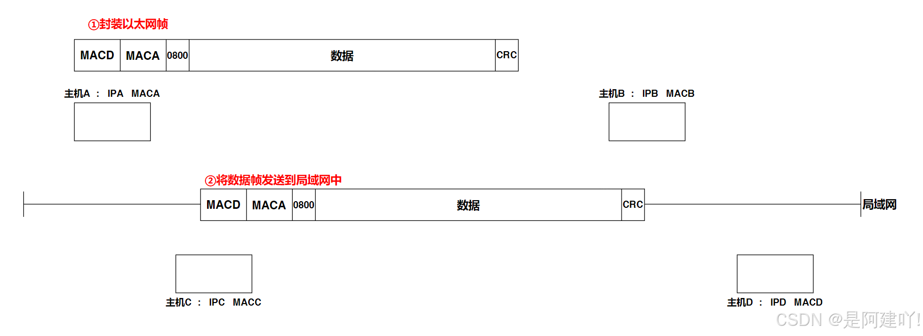 然后主机A将数据通过网络协议栈封装后,将数据帧发送到局域网中。