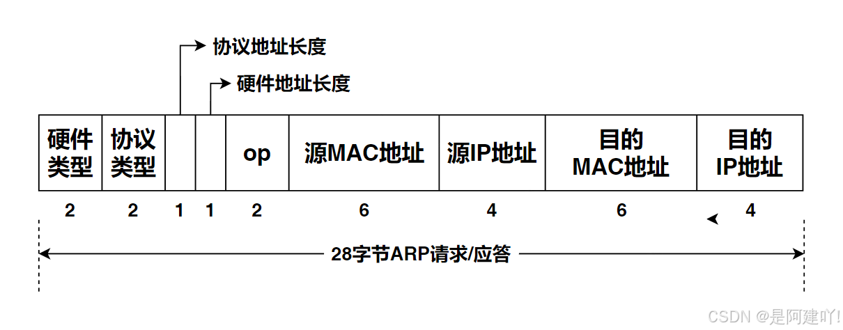 - op字段:为1表示ARP请求,为2表示ARP应答