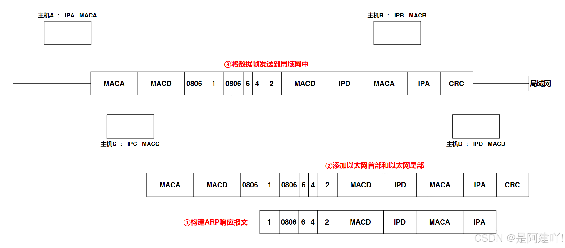 主机D向主机A发送ARP响应报文,首先需要构建一个ARP响应报文,然后为报文封装以太网首部和尾部成为数据帧,最后再将数据帧发送到局域网中。