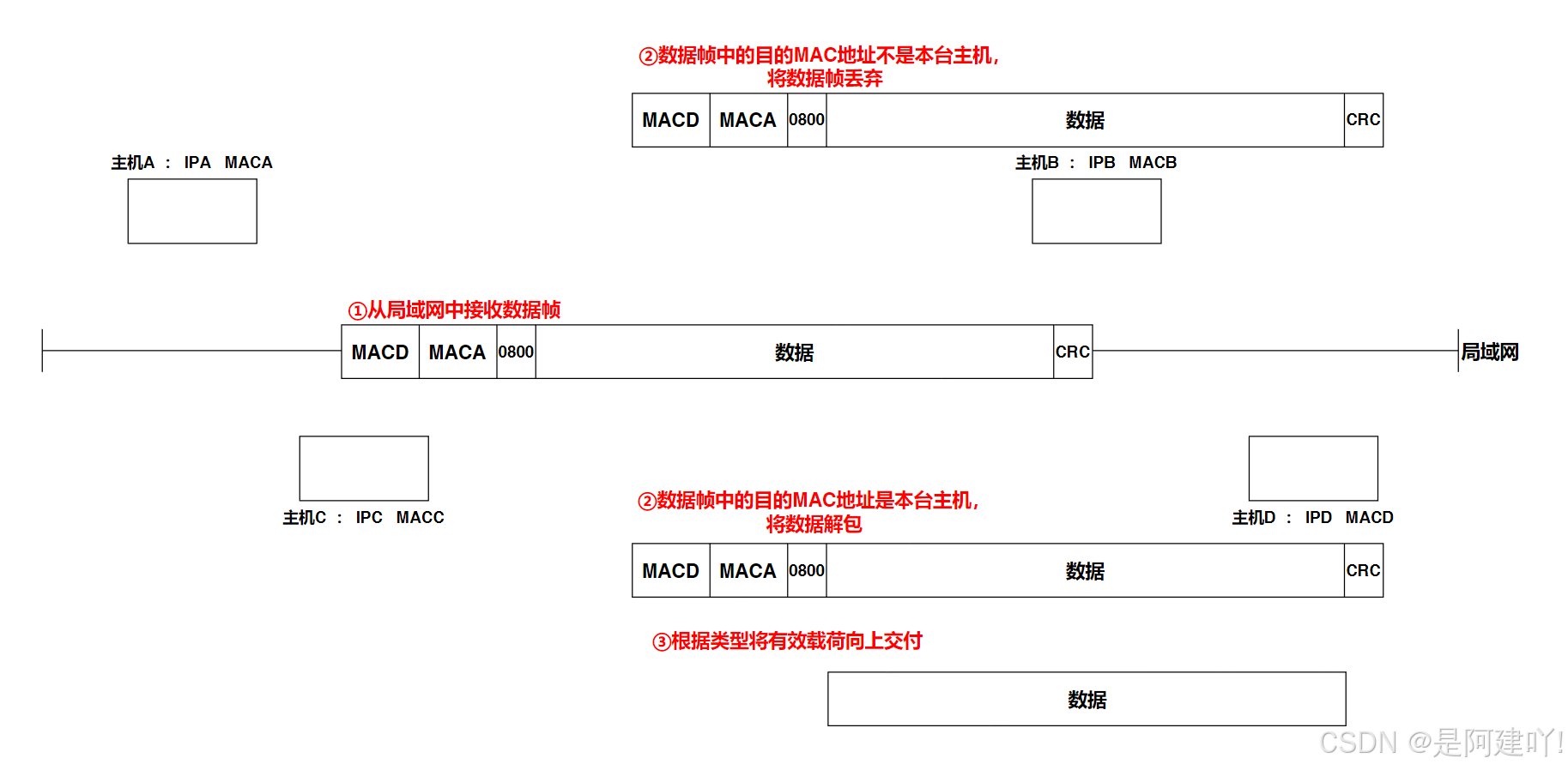 最后,局域网中的其他主机收到数据帧后,主机会通过读取数据帧中的目的MAC地址,会分为两种情况
