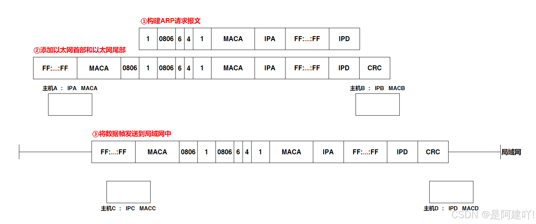主机A会先构建一个ARP请求报文,然后为报文封装以太网首部和尾部成为数据帧,最后再将数据帧发送到局域网中。