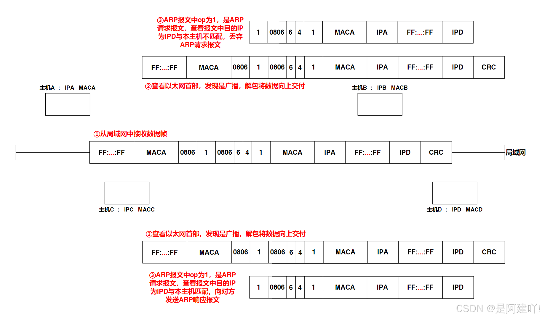 最后,局域网中的其他主机收到数据帧后,主机通过读取数据帧中的目的MAC地址,发现是广播地址,然后会将数据帧解包,将有效载荷(ARP请求报文)向上交付,这里会分为两种情况