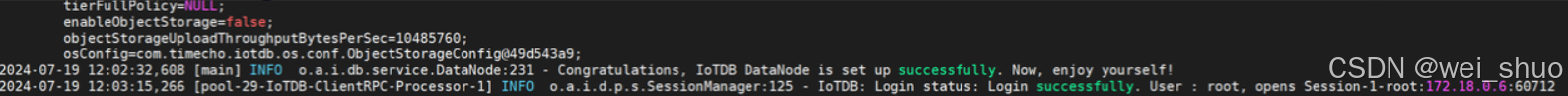docker logs -f iotdb-datanode #查看日志命令 2024-07-19 12:02:32,608 [main] INFO o.a.i.db.service.DataNode:231 - Congratulations, IoTDB DataNode is set up successfully. Now, enjoy yourself!