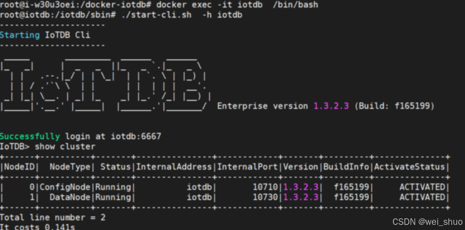 docker exec -it iotdb /bin/bash #进入容器 ./start-cli.sh -h iotdb #登录数据库 IoTDB> show cluster #查看状态