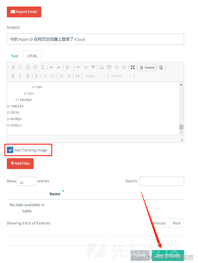 确认无误后点击保存,这里的 Add Tracking Image 的作用是在你的邮件内添加一张看不到的图片,用来判断是受害者是否点击了该邮件,用来统计数据使用。