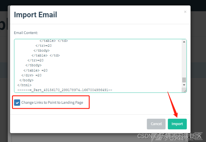 粘贴内容并点击导入。这里的 Change Links to Point to Landing Page 意思是将邮件内的链接替换成显示钓鱼页面的地址。因为你还没设置,所以使用 {{.URL}} 暂填代替。